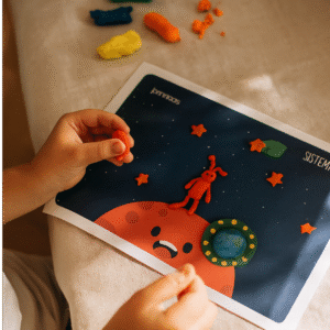 Outra brincadeira: Troque a massinha por pincéis para quadro branco e experimente desenhar sobre o plástico. Depois é só usar um paninho ou lenço de papel e apagar tudo. Você terá um “desenha e apaga“!